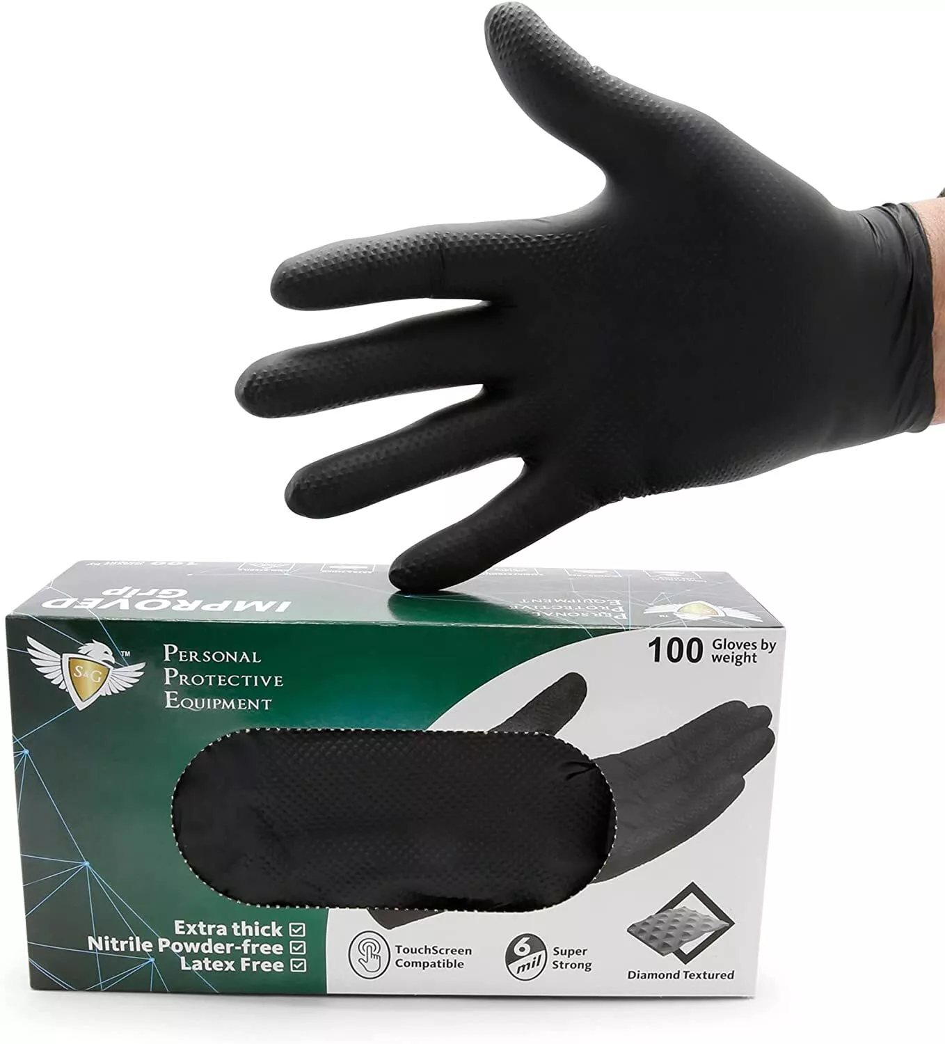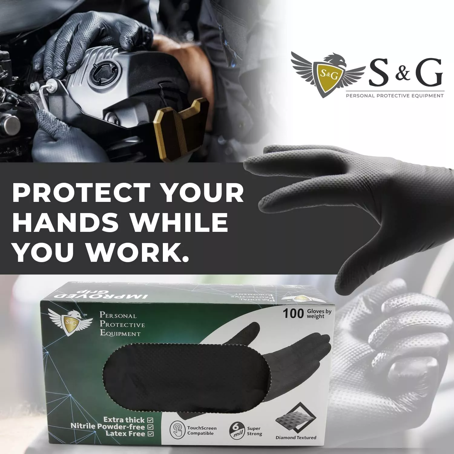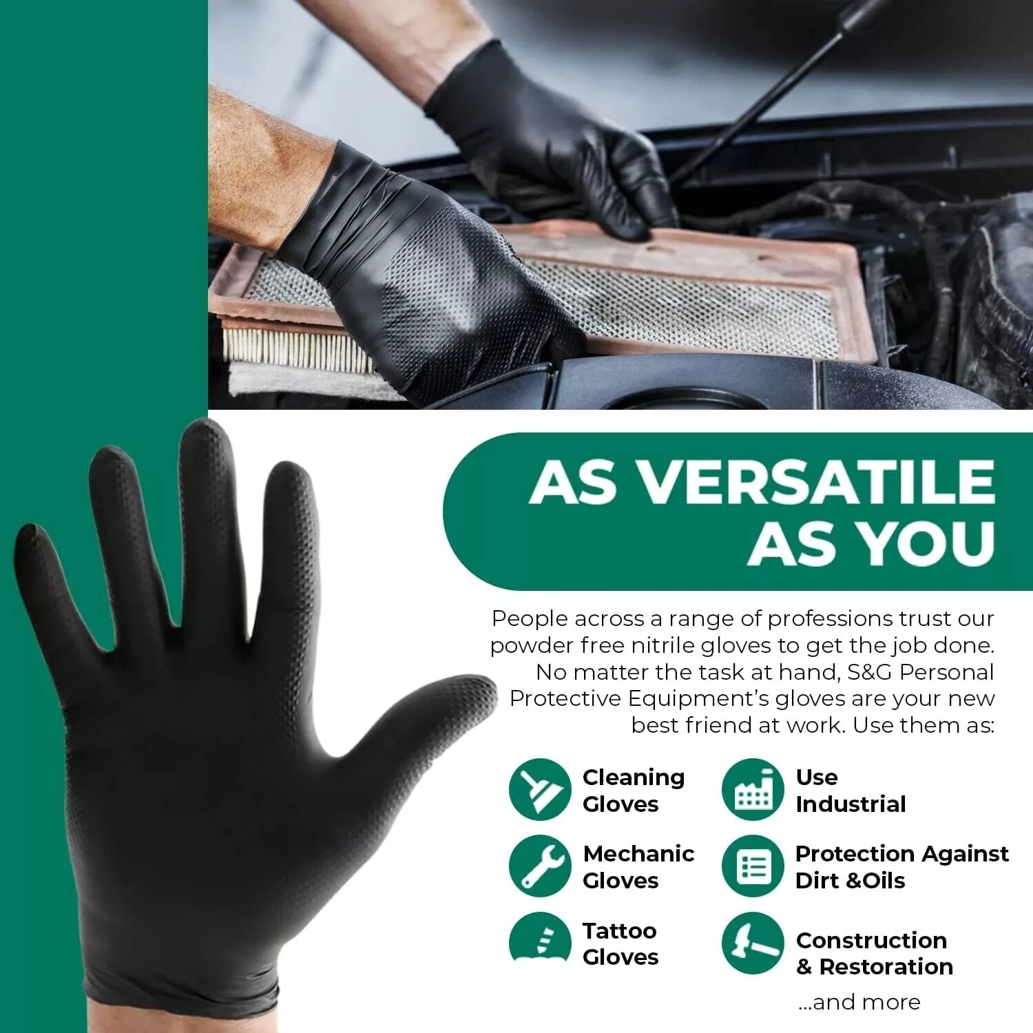 S&G’s heavy-duty black nitrile gloves are crafted from high-quality 6 mil nitrile, ensuring exceptional durability and puncture resistance. Designed for tough, demanding jobs, these latex-free, disposable gloves are perfect for a wide range of industrial applications. The gloves feature an advanced diamond texture with 3,000 grip points per glove, offering outstanding dexterity and tactile sensitivity. The diamond nano pattern effectively channels liquid away, keeping hands dry and allowing for easy touchscreen use.