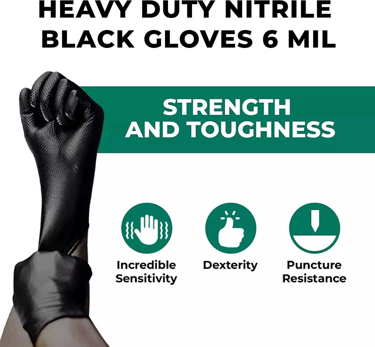 Made from synthetic rubber, these 6 mil gloves are thicker than standard options, providing extra protection while maintaining flexibility and comfort during extended wear. The sleek black finish gives them a professional appearance, making them the top choice in various industries. Developed with input from PPE experts, these gloves deliver reliable performance and maximum safety.